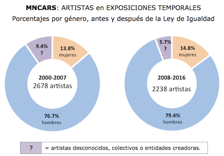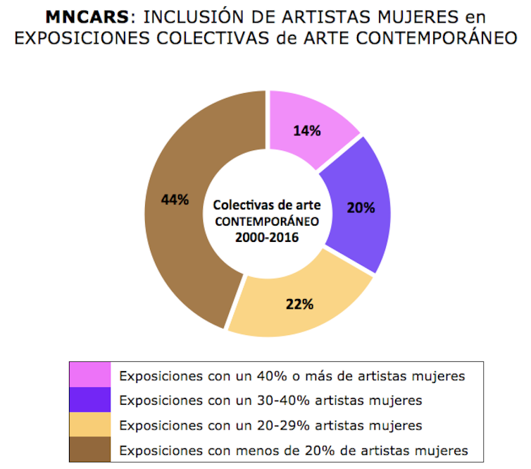 Les col·lectives d’art modern al Museu Reina Sofia rares vegades inclouen un 20% o més d’artistes dones. Lògicament, és més fàcil localitzar artistes contemporànies que de generacions passades. Però l’anàlisi de les exposicions no veu grans millores en el desequilibri d’artistes per sexe quan el focus és l’art creat des de la dècada de 1970.