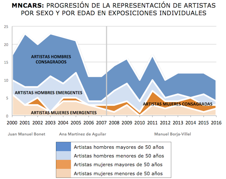 Aprofundint en les xifres i mesurant diferents variables, es descobreix que les exposicions petites d’art actual tendeixen a la paritat i que, en els últims deu anys estudiats, les exposicions individuals a artistes dones al MNCARS han pujat d’un 20% a un 30%, un augment que incorpora moltes artistes amb una llarga trajectòria. Les artistes difuntes o de més edat, les obres d’importància històrica de les quals amb prou feines s’exposaven, han rebut més atenció per part del museu des de l’any 2008 d’ara endavant.