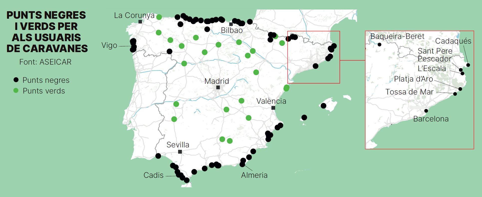 La patronal ha elaborat un mapa amb punts verds (zones favorables) i punts negres (àrees restrictives) a partir d’una enquesta a un miler d’autocaravanistes. La principal conclusió és que les zones costaneres –especialment, les que en determinades temporades pateixen saturació turística– concentren més restriccions, mentre que l’Espanya buidada –àvida de nous veïns, tot i que siguin passatgers– resulta bastant més benèvola.