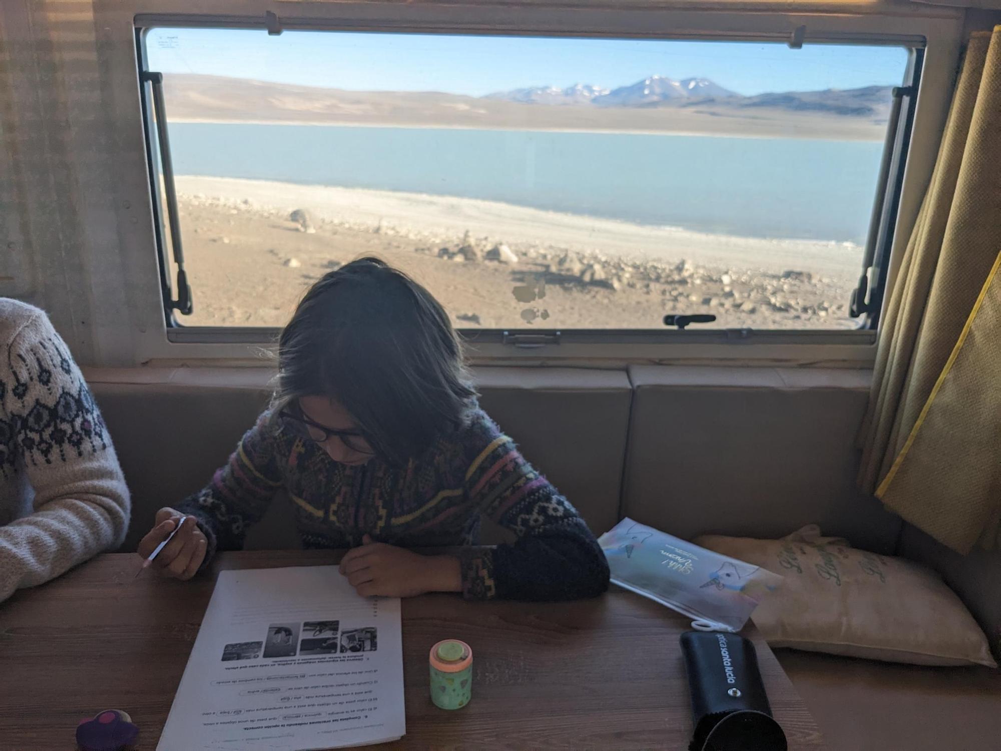 Durant aquest temps, però, va continuar estudiant, primer en la modalitat d'instrucció en família, un sistema reconegut a França a partir d'on els pares, seguint "unes directrius pedagògiques", es converteixen en tutors ("li vam ensenyar a llegir, a escriure, a resoldre problemes matemàtics bàsics, coneixements d'història, geografia, ciència o natura, però això és molt fàcil quan estàs viatjant perquè tens el volcà allà davant i pots veure en directe els diversos elements", relata la seva mare, Cinta P.). Quan la seva filla tenia nou anys va començar a estudiar a distància, una alternativa reconeguda pel Ministeri d'Educació ideada pels infants que viuen fora de les fronteres de l'Estat espanyol. "Necessitàvem uns estudis que fossin reconeguts perquè havíem de pensar en el futur de la nostra filla", assegura.