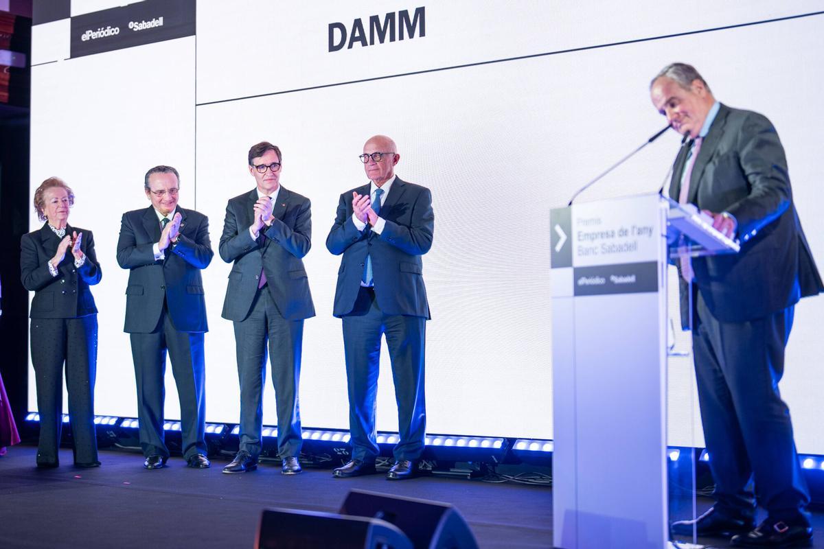 Demetrio Carceller Arce, president executiu de DAMM, rep el premi Empresa de l'Any 2025, de mans de Javier Moll, president de Prensa Ibérica; Arantza Sarasola, vicepresidenta de Prensa Ibérica; Josep Oliu, president del Banc Sabadell, i Salvador Illa, president de la Generalitat de Catalunya. -