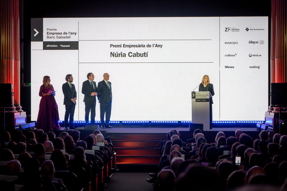 Núria Cabutí, CEO de Penguin Random House, rep el vuitè guardó com a Empresària de l'Any. Fan lliurament del premi Aitor Moll, conseller delegat de Prensa Ibérica; Josep Oliu, president de Banc Sabadell, i Josep Rull, president del Parlament de Catalunya. La cerimònia dels Premis Empresa de l'Any 2025 ha tingut lloc en el Palauet Casades de Barcelona. -
