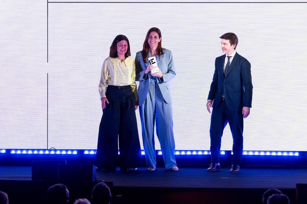 Teresa Pueyo, CEO de Superlativa, recull el premi a Millor Startup de l'Any. Fan lliurament del guardó Yolanda Pérez, directora de Bstartup i HubEmpresa, i Sergi Guillot, director general d'EL PERIÓDICO. -